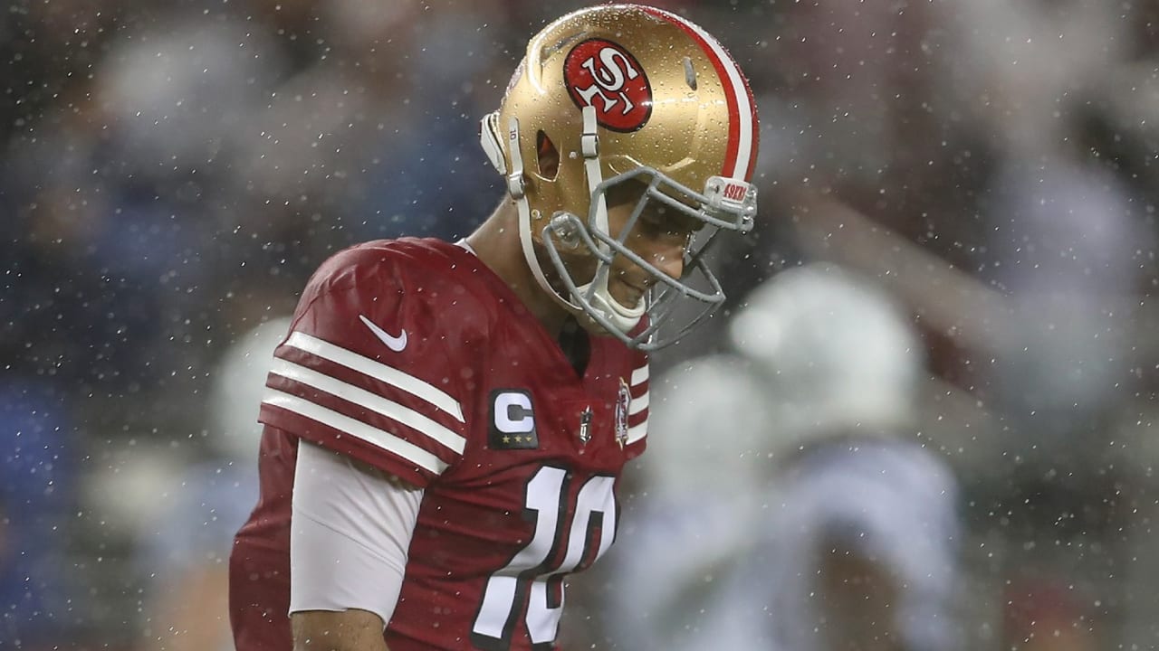 The heavy rain that didn't abate all game clearly played a significant role in the Niners' struggles, as Garoppolo had issues finding a grip and keeping his passes on target.
